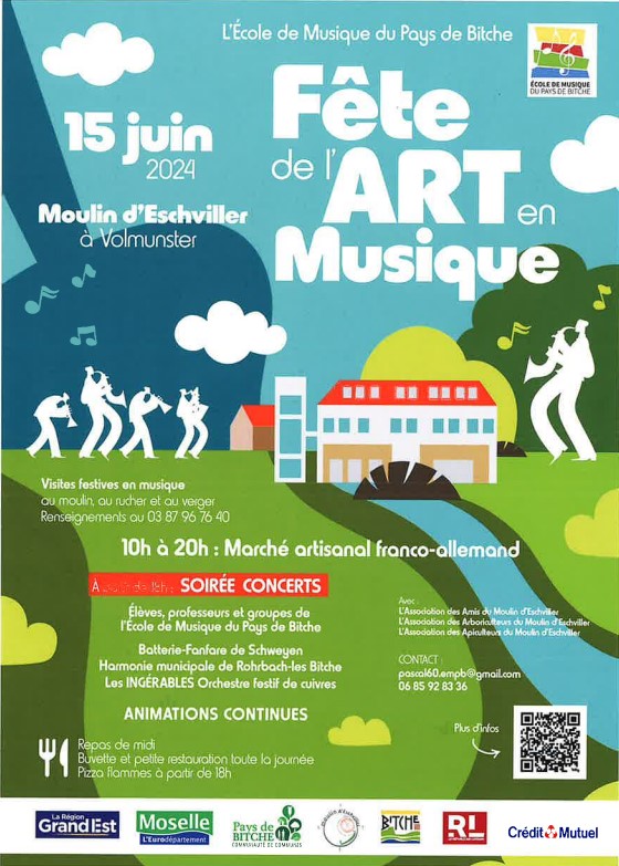 ![]() | Le 15 juin 2024 au Moulin d'Eschviller, la fête de l'art et de la musique. De 10h à 20h : Marché artisanal Franco-Allemand A partir de 18h, soirée concert |